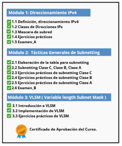 Al finalizar el curso, el estudiante será capaz de comprender, diseñar y calcular subredes IPv4 de manera precisa y eficiente, aplicando técnicas de subnetting, VLSM y segmentación de redes que se utilizan en entornos reales de redes empresariales. Podrá planificar direccionamientos IP, optimizar redes, resolver ejercicios de certificaciones y desenvolverse con seguridad en áreas de redes Cisco, MikroTik, Fortinet y otras plataformas.